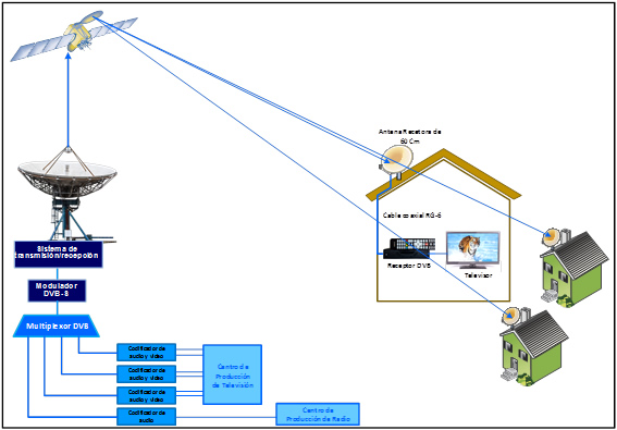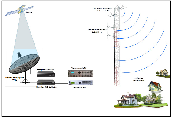 El esquema planteado consta de un sistema de transmisión de señales de Radio y TV que mínimamente llevaría 03 canales de TV y 02 canales de radio.