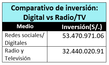 Medios digitales y Redes sociales: 16 entidades usaron plataformas digitales, sumando 53,470,971.06 soles en inversión. Esta cifra supera por más de 20 millones a lo invertido en medios convencionales.